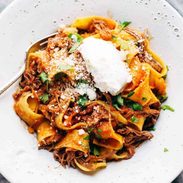 We’re making this cozy, comforting Beef Ragu with Pappardelle! Steak is braised in the crockpot for hours with garlic, tomatoes, veggies, and herbs, then shredded and piled high on pappardelle with Parm cheese.